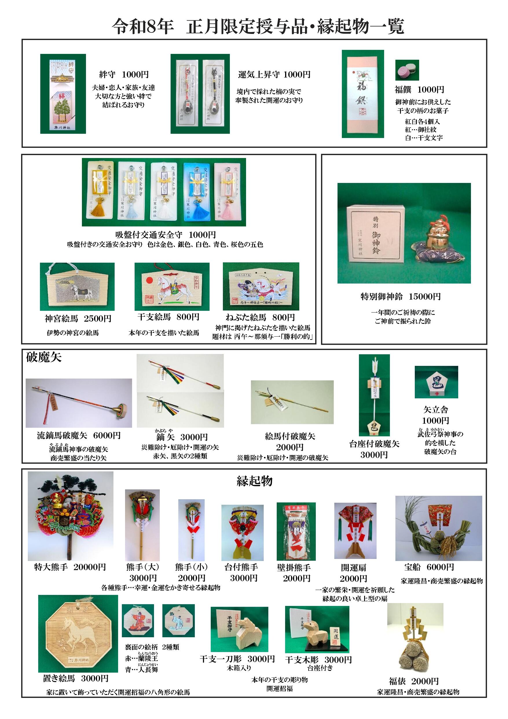 令和8年元旦より、下記正月縁起物及び限定授与品を頒布致します。