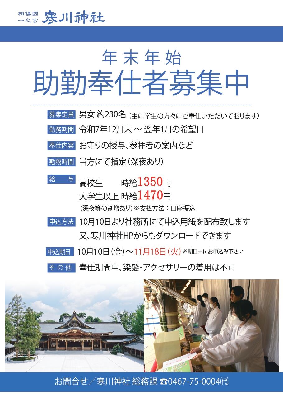 寒川神社では年末年始の助勤奉仕者を下記の通り募集致します。申込用紙は当神社社務所にて配布、またはホームページよりダウンロード可能です。※お申込みの際には、「奉仕要項」、「申込用紙」を必ずお読みください 【申込用紙の配布、提出場所】 寒川神社 社務所【時 間】 午前8時30分から午後5時まで(土・日・祝祭日可)※上記時間以外の受付はできません 奉仕要項.pdf 申込用紙.pdf